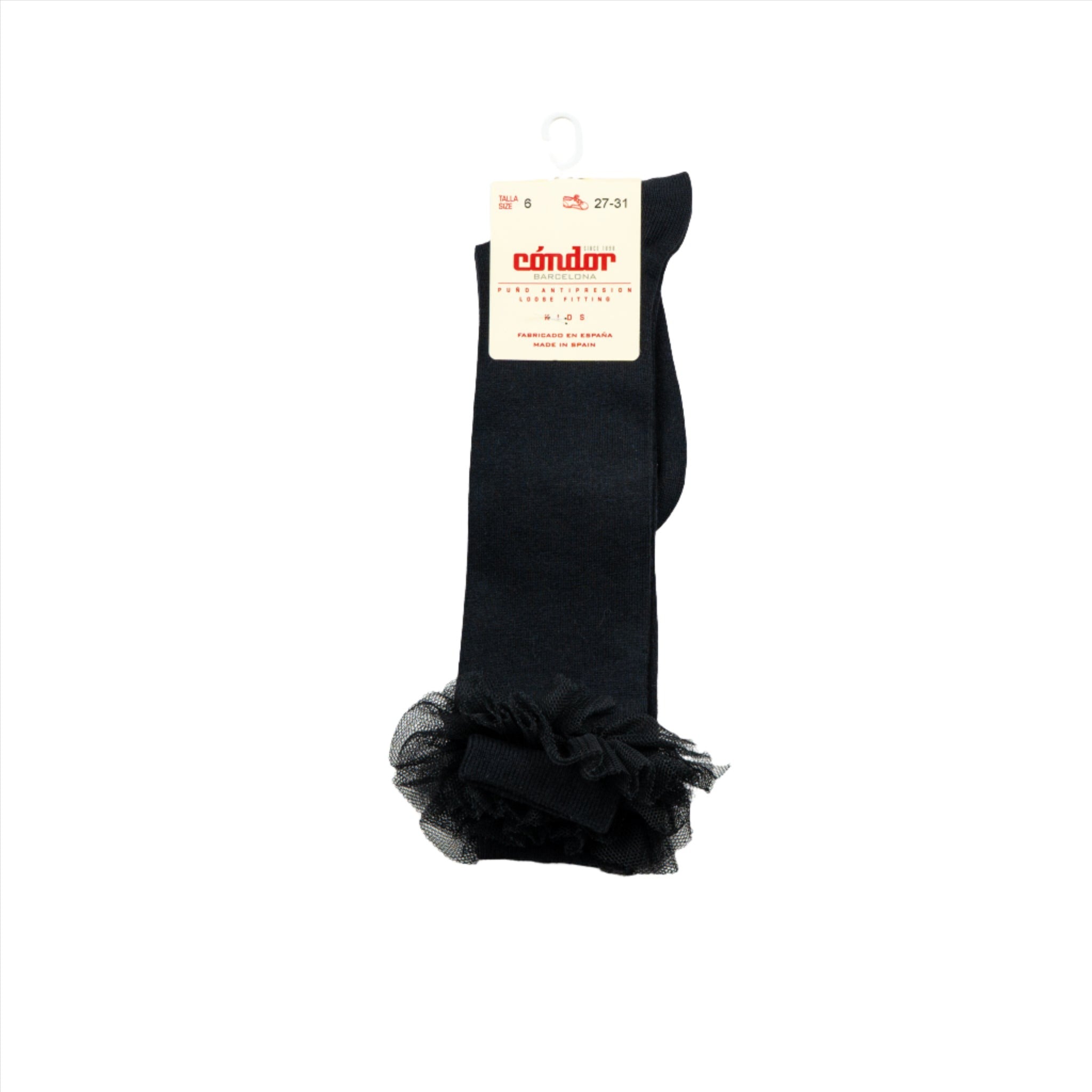 Kvalitatīvas kokvilnas bērnu zeķes ar tilla savilkumu augšējā daļā melnā krāsā.