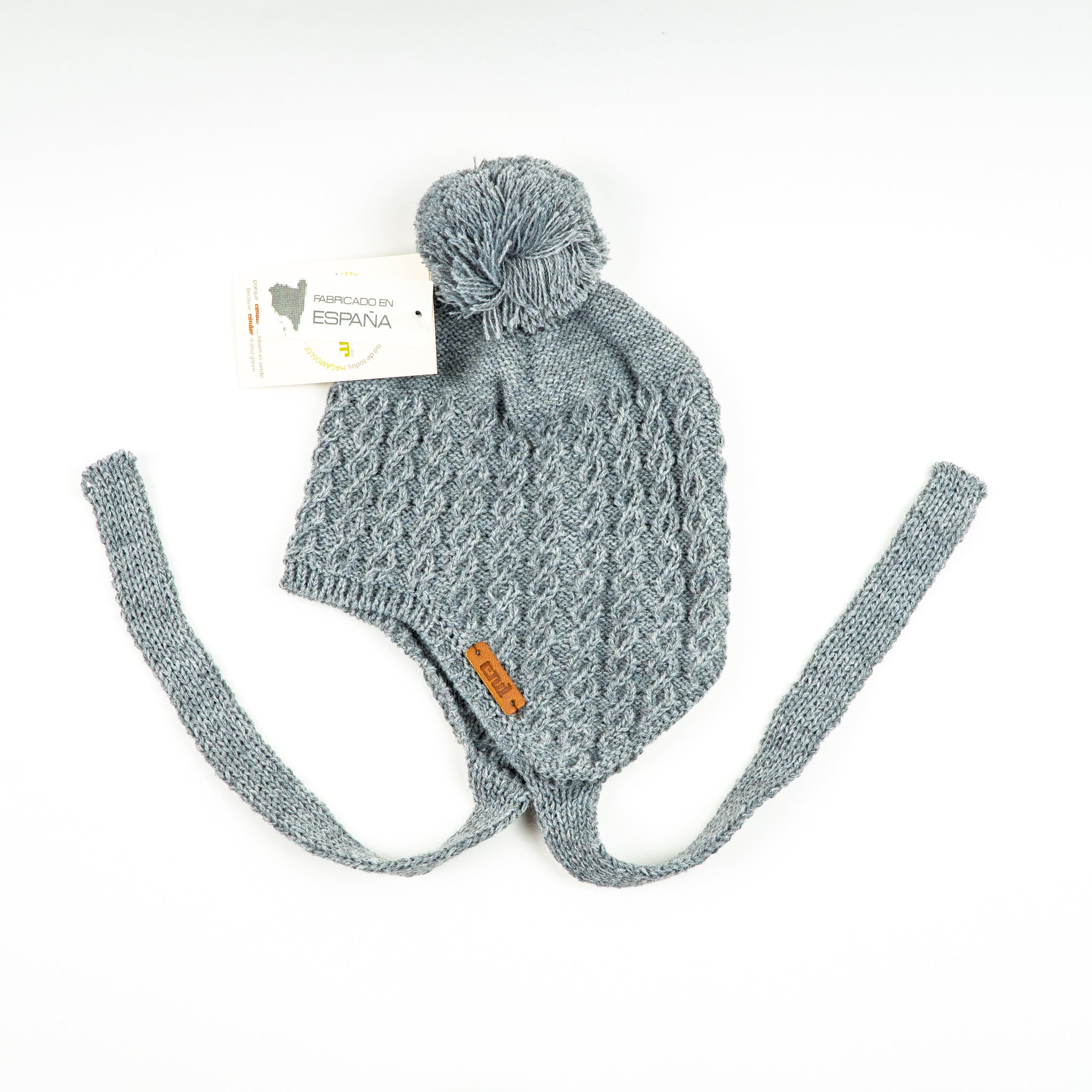 Izsmalcināta bērnu cepure pelēkā krāsā ar rakstu un bumbulīti. Cepure ir sasienama.