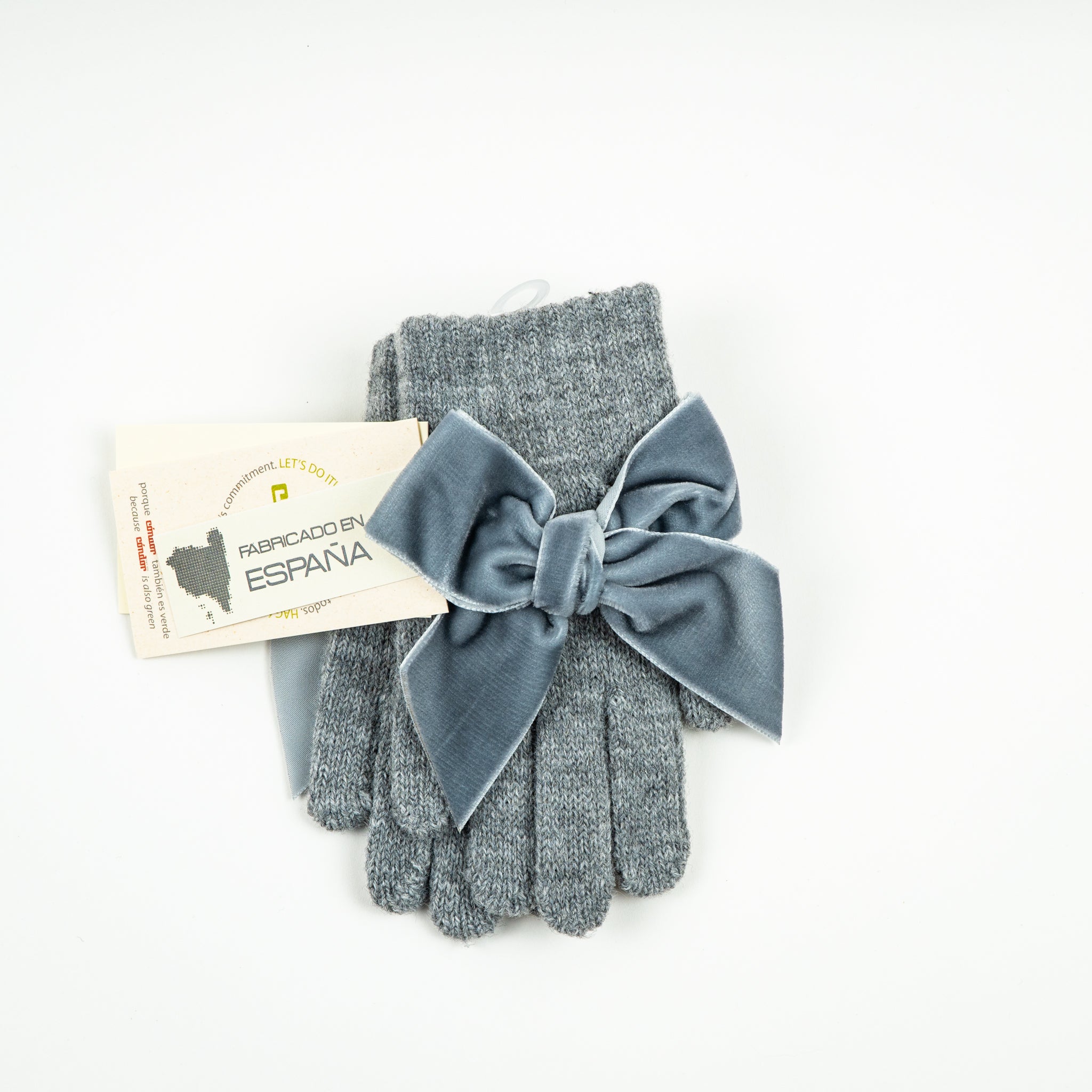 Bērnu cimdi ar samta bantīti gaiši pelēkā krāsā.
