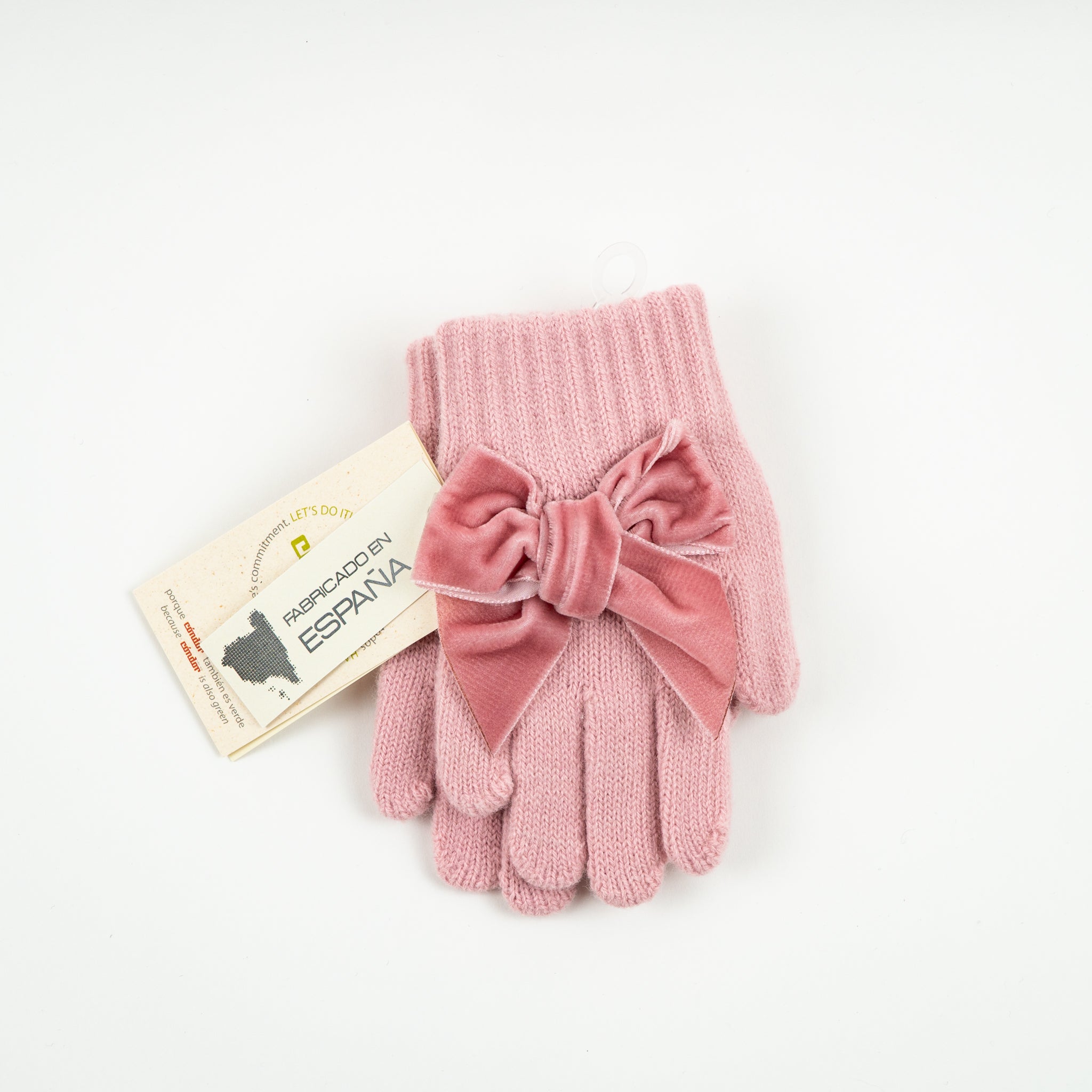 Bērnu cimdi ar samta bantīti gaiši rozā krāsā.