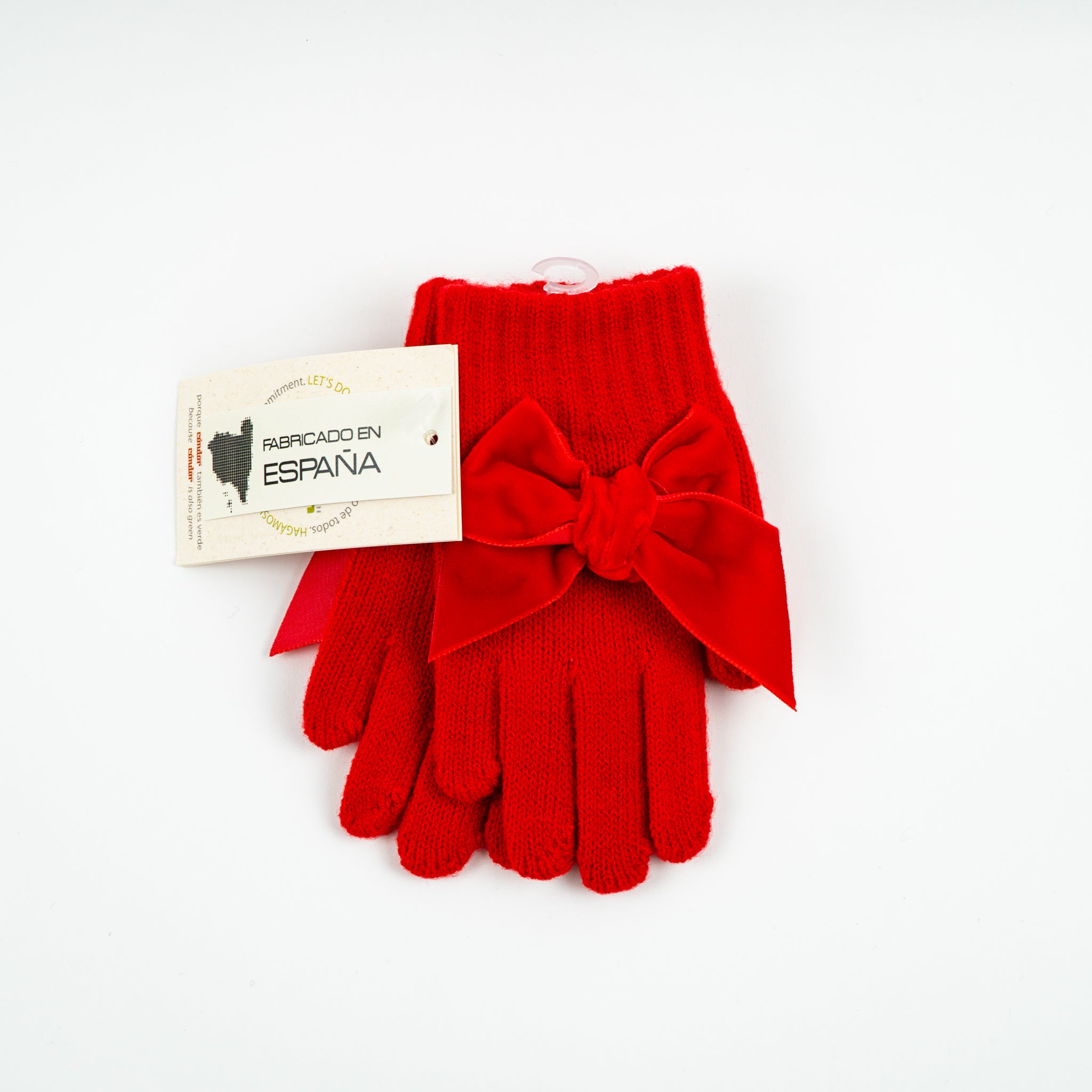 Bērnu cimdi ar samta bantīti sarkanā krāsā.