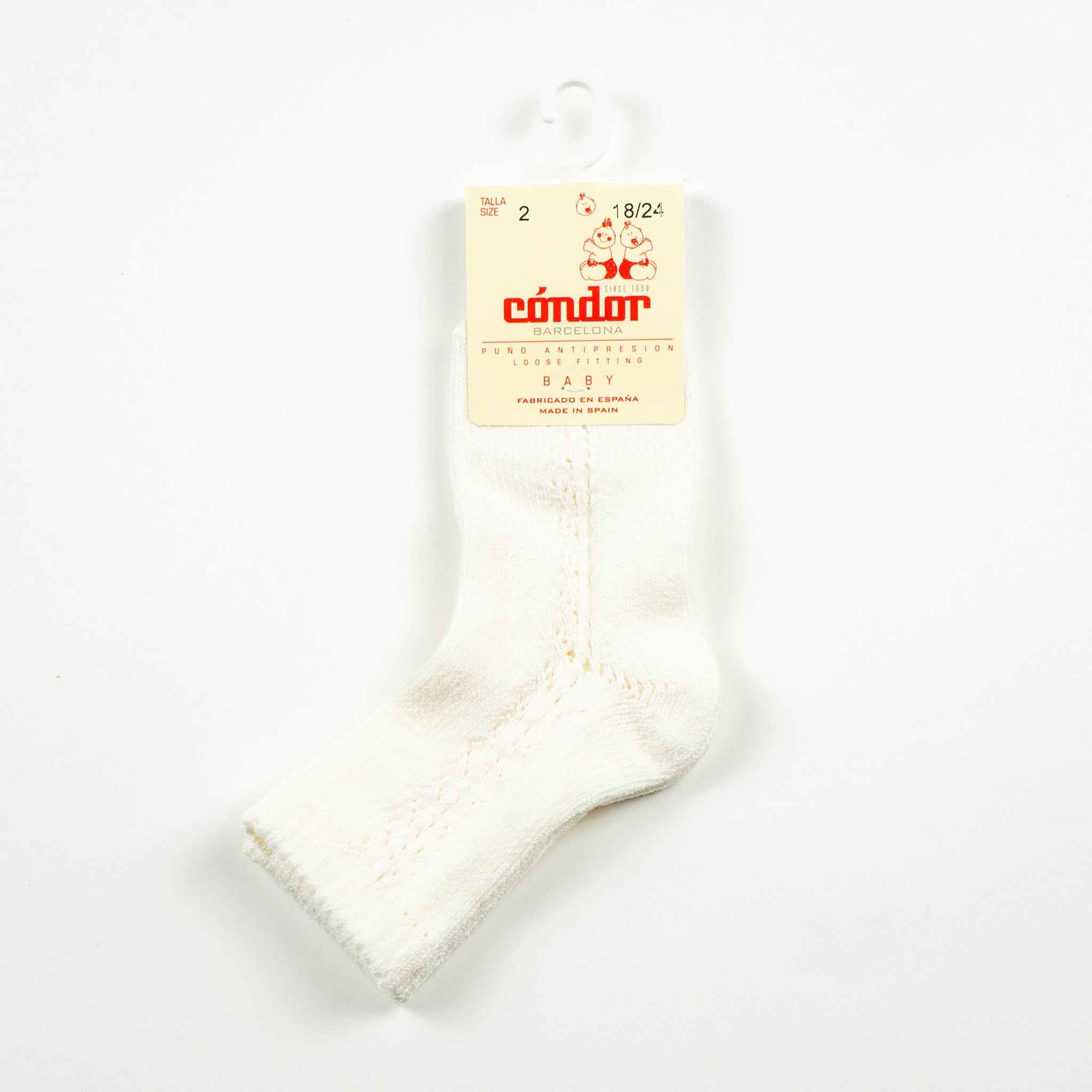 Kvalitatīvas kokvilnas bērnu zeķes bēšā krāsā ar rakstu sānā.