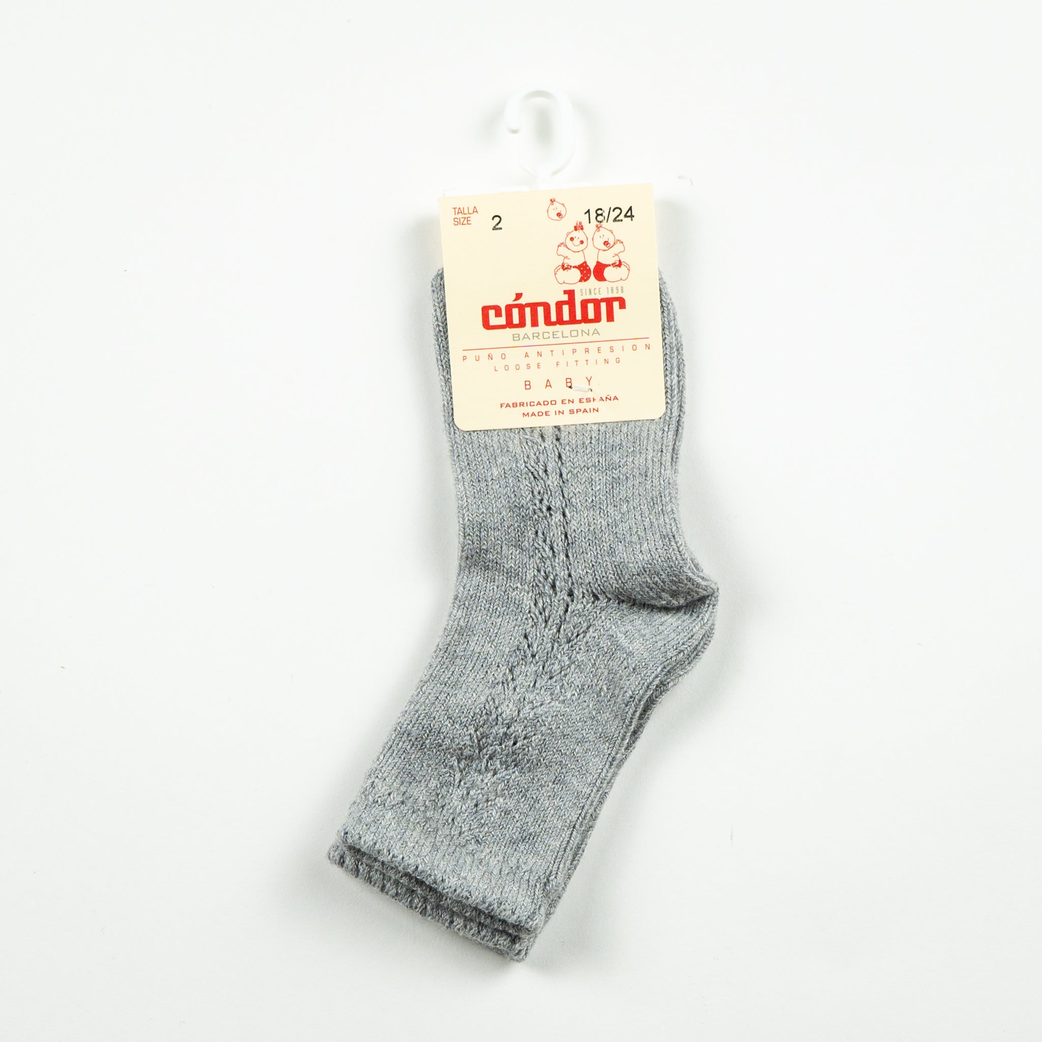Kvalitatīvas kokvilnas bērnu zeķes pelēkā krāsā ar rakstu sānā.